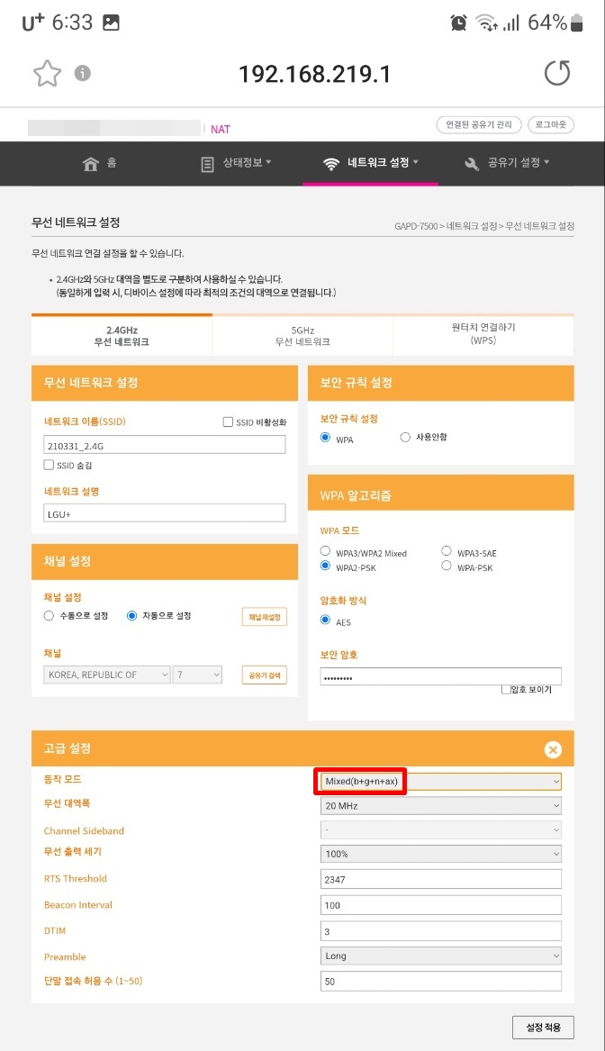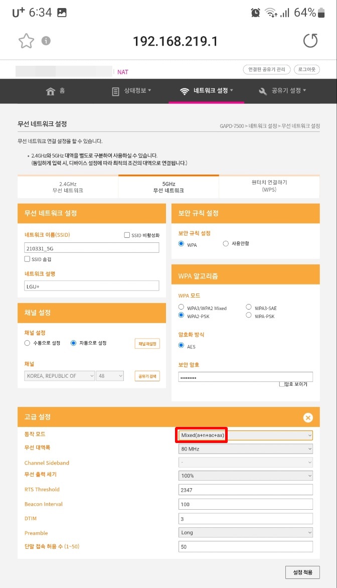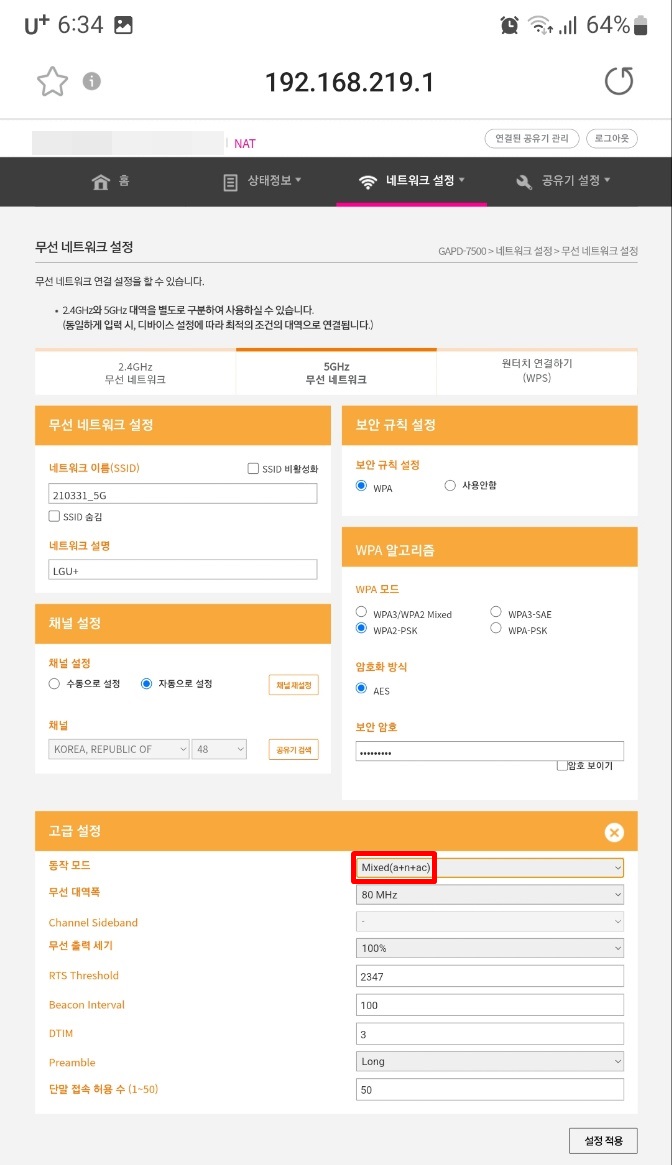 고급설정에서 동작모드가 Mixed(b+g+n+ax) 로 되어있는 것을