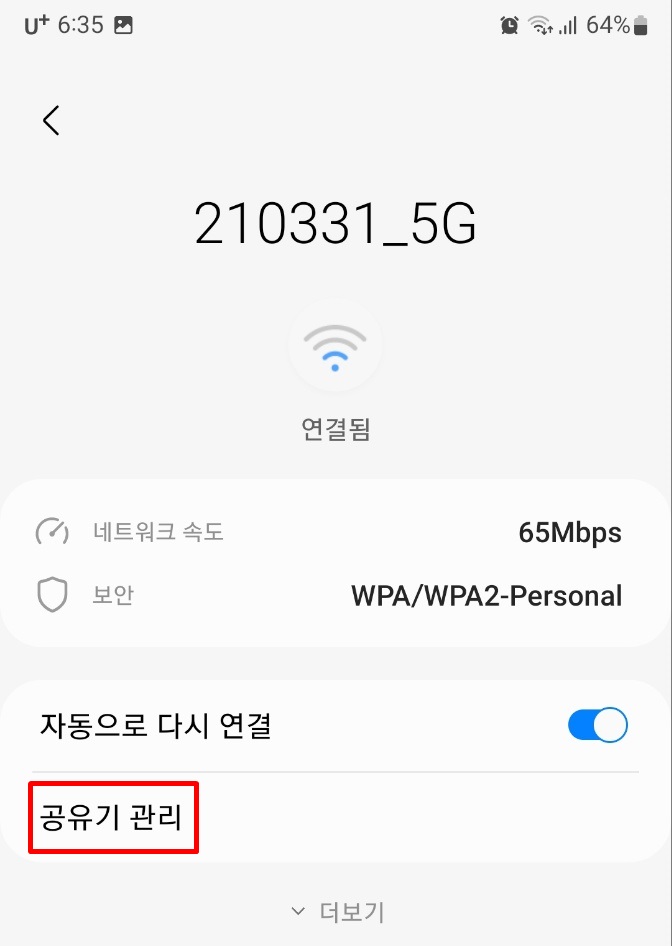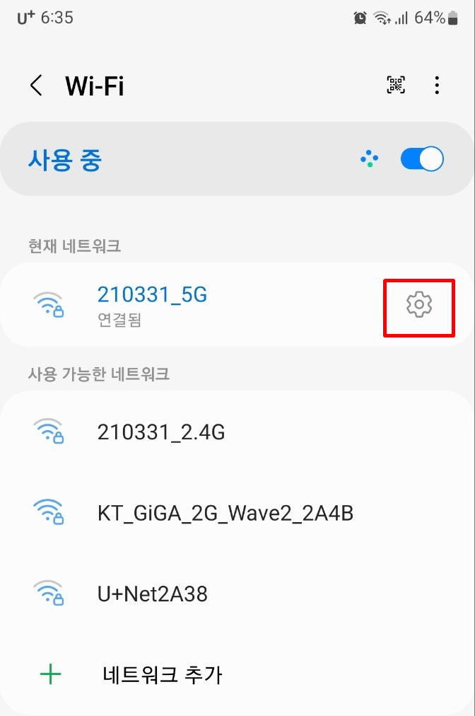 스마트폰 와이파이로 들어가면 연결된 와이파이에 톱니바퀴 모양이 있습니다.