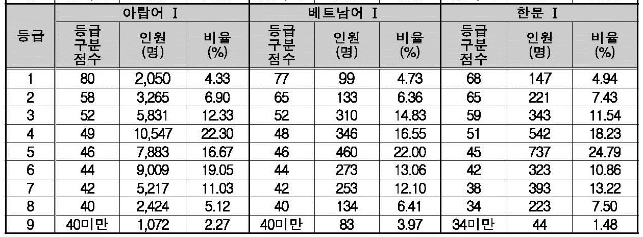 2019학년도 제2외국어/한문 영역(아랍어1, 베터남어1, 한문1) 확정 등급컷, 구분 표준점수 입니다.