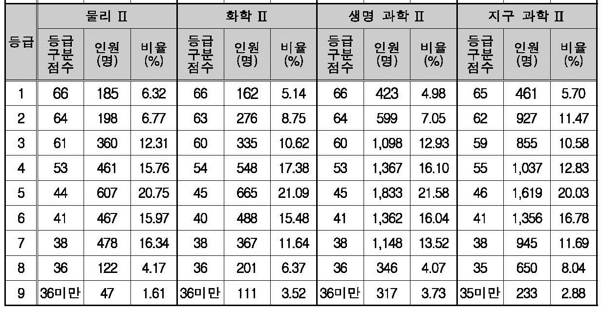 2019학년도 과학탐구 영역(물리2, 화학2, 생명 과학2, 지구 과학2) 확정 등급컷, 구분 표준점수 입니다.