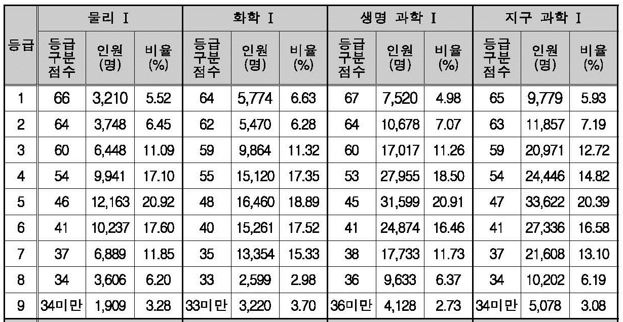 2019학년도 과학탐구 영역(물리1, 화학1, 생명 과학1, 지구 과학1) 확정 등급컷, 구분 표준점수 입니다.