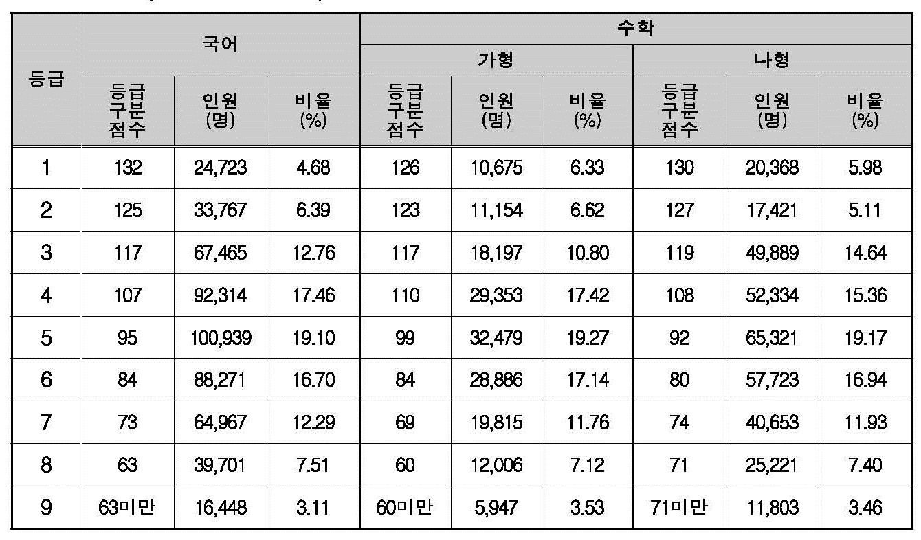 2018학년도 대학수학능력시험 등급컷 표준점수