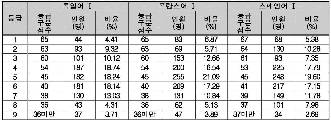 2021학년도 제2외국어/한문 영역(독일어1, 프랑스어1, 스페인어1) 확정 등급컷 및 구분 표준점수 입니다.