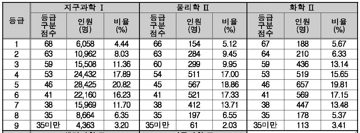 2022학년도 과학탐구 영역(지구과학1, 물리학2, 화학2) 확정 등급컷 및 구분 표준점수 입니다.