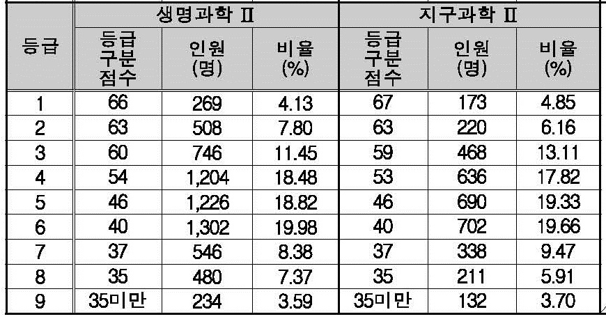 2022학년도 과학탐구 영역(생명과학2, 지구과학2) 확정 등급컷 및 구분 표준점수 입니다.
